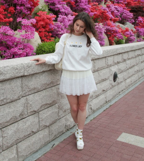 I am thinking of leaving ultra short mini skirts behind when I leave Korea (though by Korean satndards, this is the normal length, haha), so I'm trying to make the most of them in the remaining time. I was really excited when I found sunflower socks that matched my recently discovered second hand treasure - a cute oversized sweatshirt (who else gets pleasant chills upon stumbling across "new with tags" items in charity shops?). I think the whole outfit more or less works, though I probably wouldn't wear it again. I think what was a big miss was my attempt at casual wavy hair, as it just ended up being sloppy, probably a messy bun wuld have been better.
